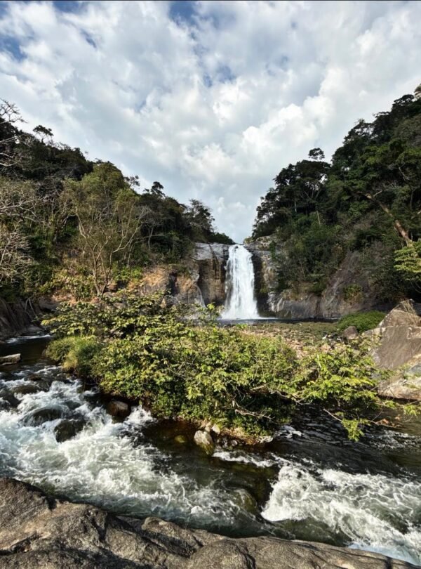 • Cascada natural con caída visible de agua clara desde una altura significativa.