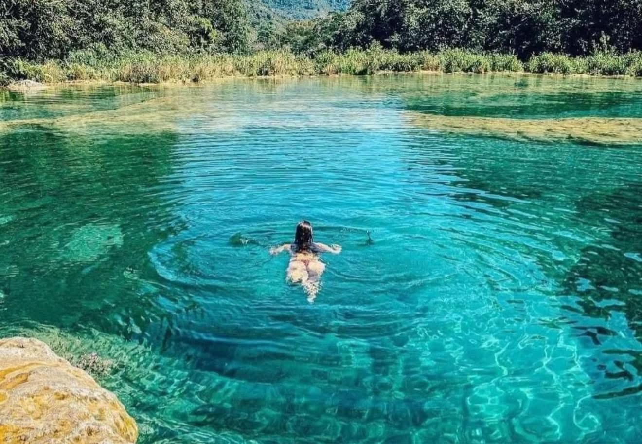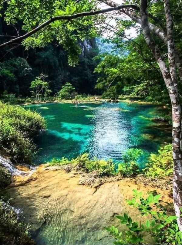 - Pozas naturales de agua turquesa formadas sobre piedra caliza en Semuc Champey.